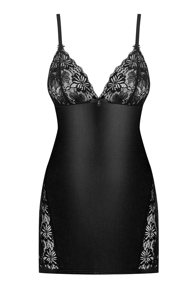 Элегантная сорочка из стрейч-атласного материала, идеально подчеркивает формы. Треугольная чашка выполнена из эластичного кружева. Сбоку сорочку украшают вставки из кружева с цветочным рисунком. В комплект входят трусики. В комплекте: сорочка, трусики-стринги.