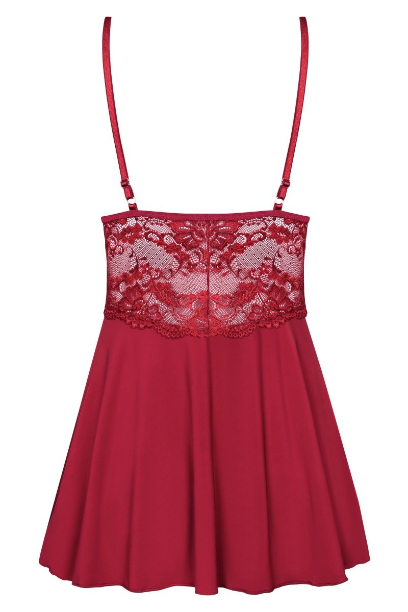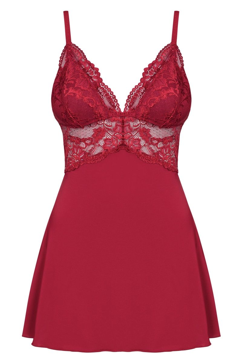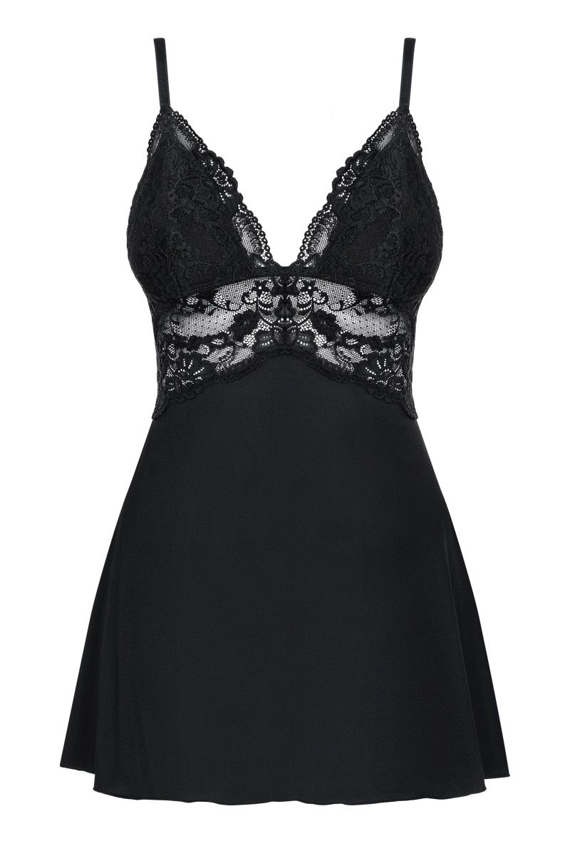 Элегантная сорочка с расклешенным силуэтом из стрейч-атласного материала, украшена кружевом. Чашка треугольная, плотная, поролон. В комплекте: сорочка и трусики-стринги.