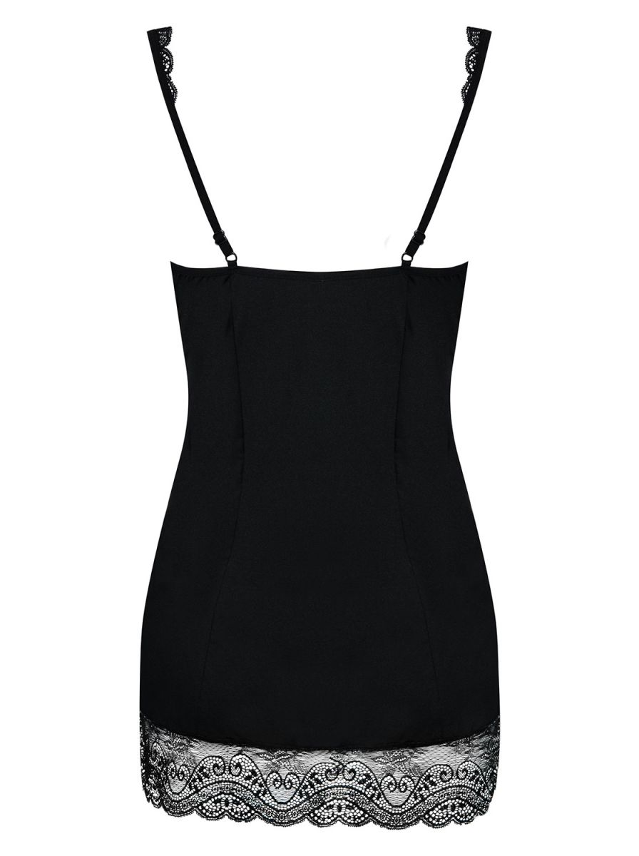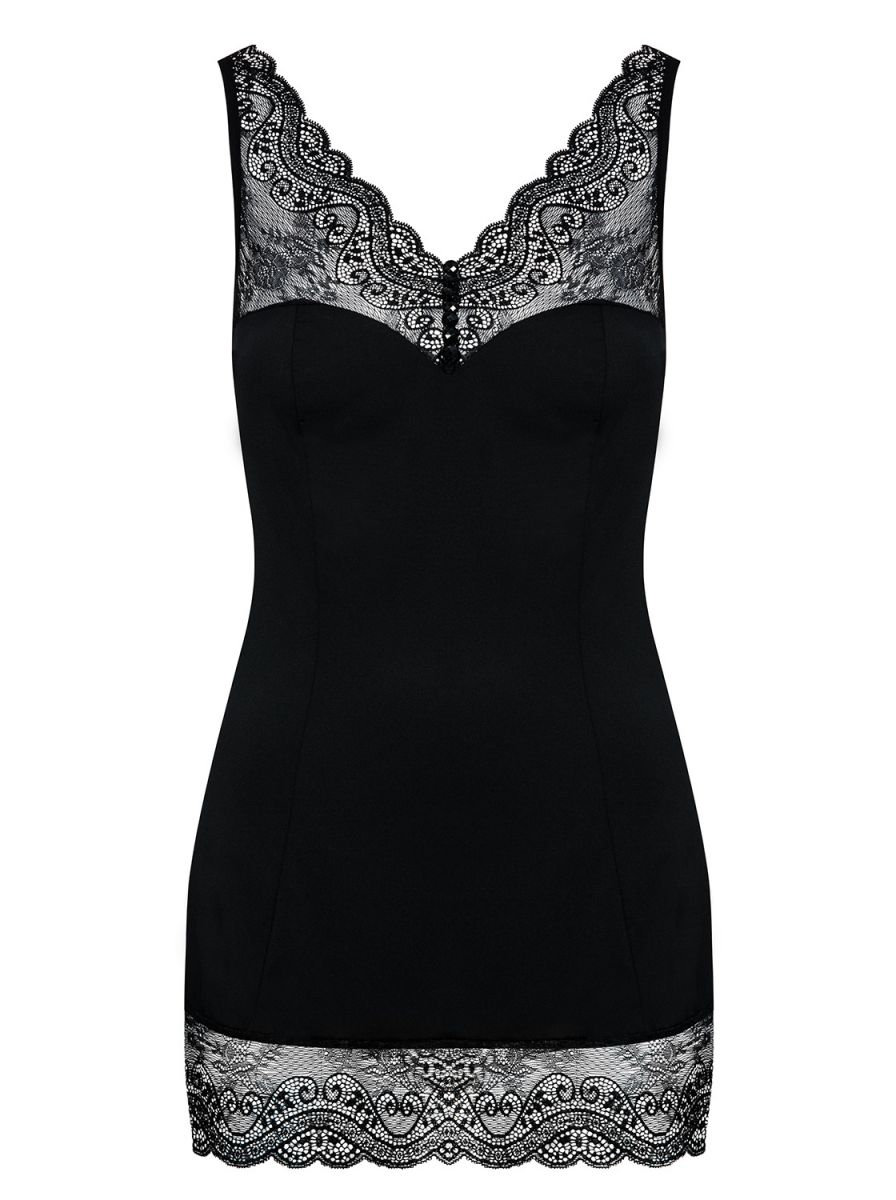 Классическая черная сорочка, вверху и внизу сорочки вставки из кружева с цветочным рисунком, V-образный вырез украшена рядом маленьких граненых пуговичек. Внизу на сорочке по бокам небольшие разрезы, верх разреза украшен рядом маленьких граненых пуговичек. Бретели регулируются по длине. В комплекте трусики стринги. В комплекте: сорочка, трусики-стринги.