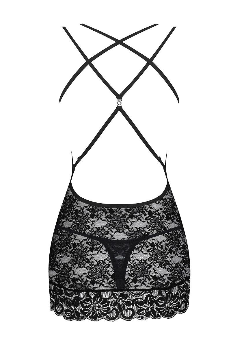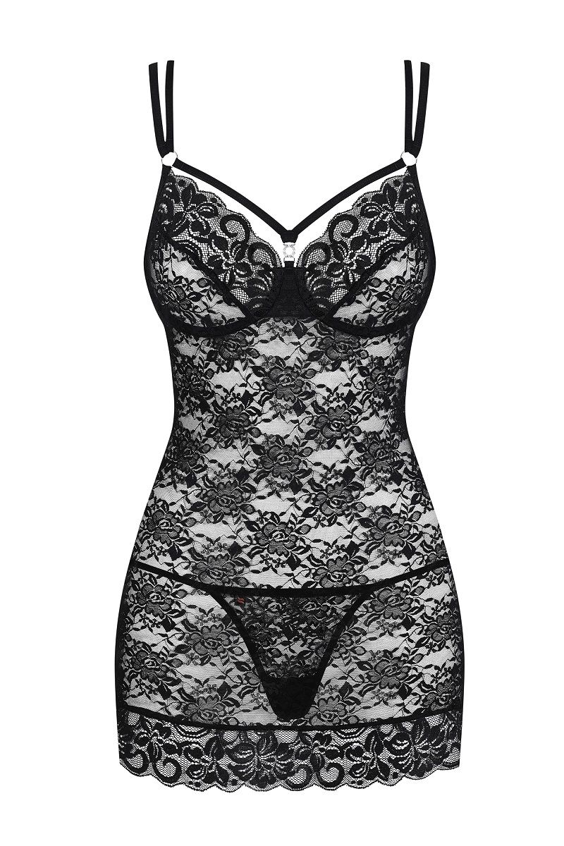 Сорочка выполнена из эластичного цветочного кружева, двойные регулируемые бретели красиво переплетаются на спинке. В комплекте: сорочка, трусики-стринги.