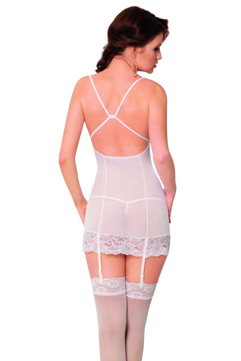Облегающая сорочка с пажами для чулок и трусиками-стринг в комплекте – то, что нужно, чтобы заслужить море комплиментов и не меньшее море поцелуев со стороны любимого. Мужчина будет сражён тем, как полупрозрачный эластичный материал облегает ваш стройный стан. Тем, каким манящим выглядит бюст из-за скрещённых бретелей и цветочных кружев с неровным краем. Маленькая брошь на груди и ажурная оторочка подола придадут образу шика. Тандем двух материй - плотной полупрозрачной и воздушной ажурной - возводит эту модель на пик сексуальности. Кружевные рюши акцентируют внимание на аккуратной груди, а расположенные крест-накрест завязочки украшают линию декольте. Вертикальные строчки зрительно делают силуэт более стройным и подтянутым. В комплекте: сорочка, трусики-стринг.