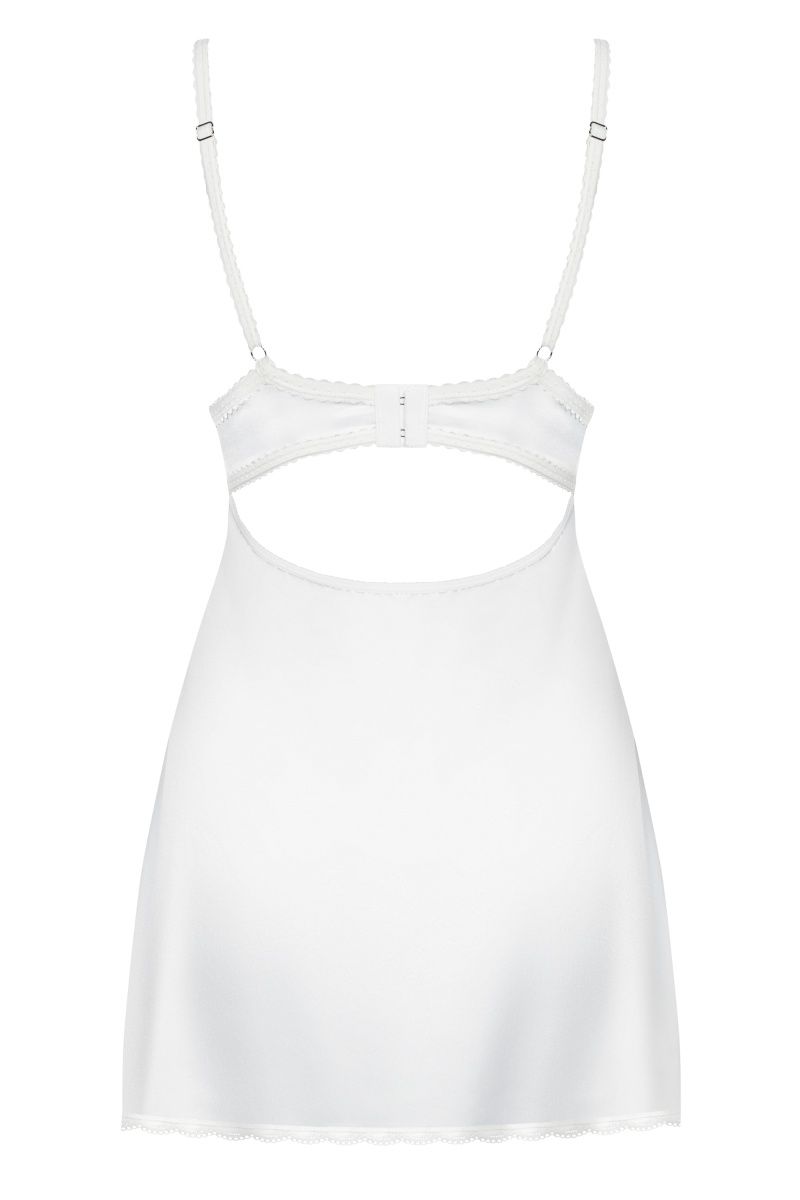 Сорочка с регулируемыми бретелями, на спинке застежка, выполнена из атласной ткани, лиф декорирован очаровательной вышивкой. В комплекте: сорочка и трусики-стринги.