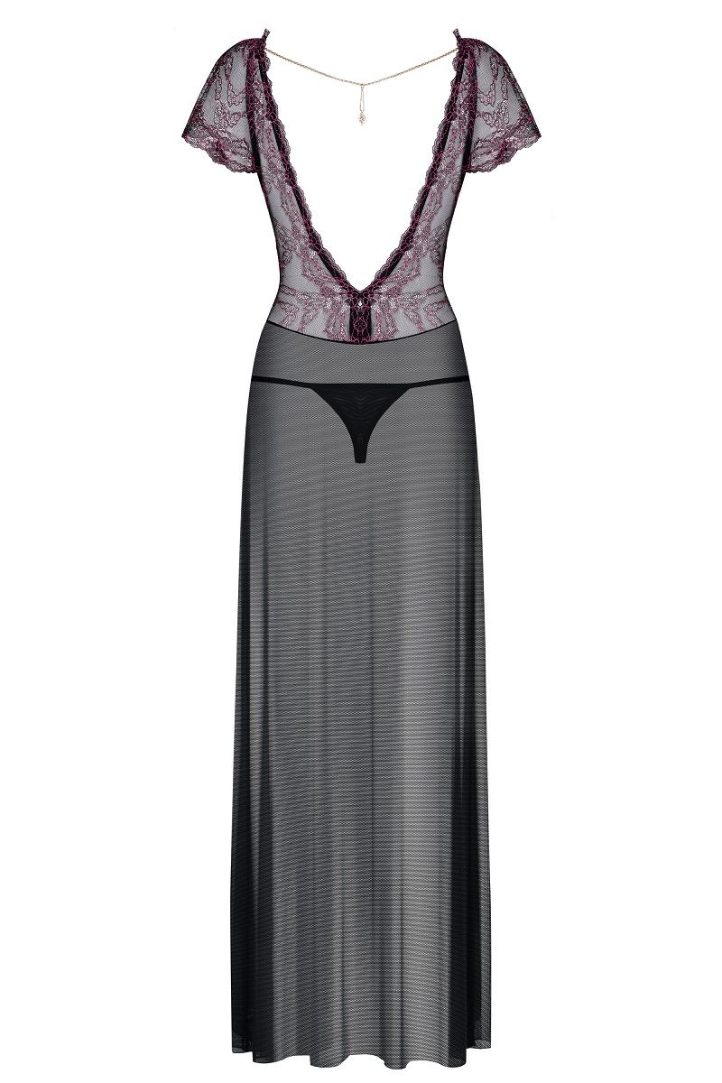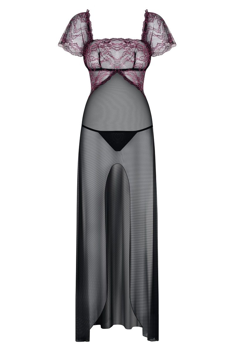 Восхитительное сочетание прозрачной сетки и кружева. Элегантный перед и соблазнительная спинка! Открытая спина с уникальным, блестящим украшением. Кружевные короткие рукава деликатно прикрывают плечи. Высокий разрез придает комплекту соблазнительной элегантности. Небольшие черные стринги в комплекте. В комплекте: сорочка, трусики-стринги.