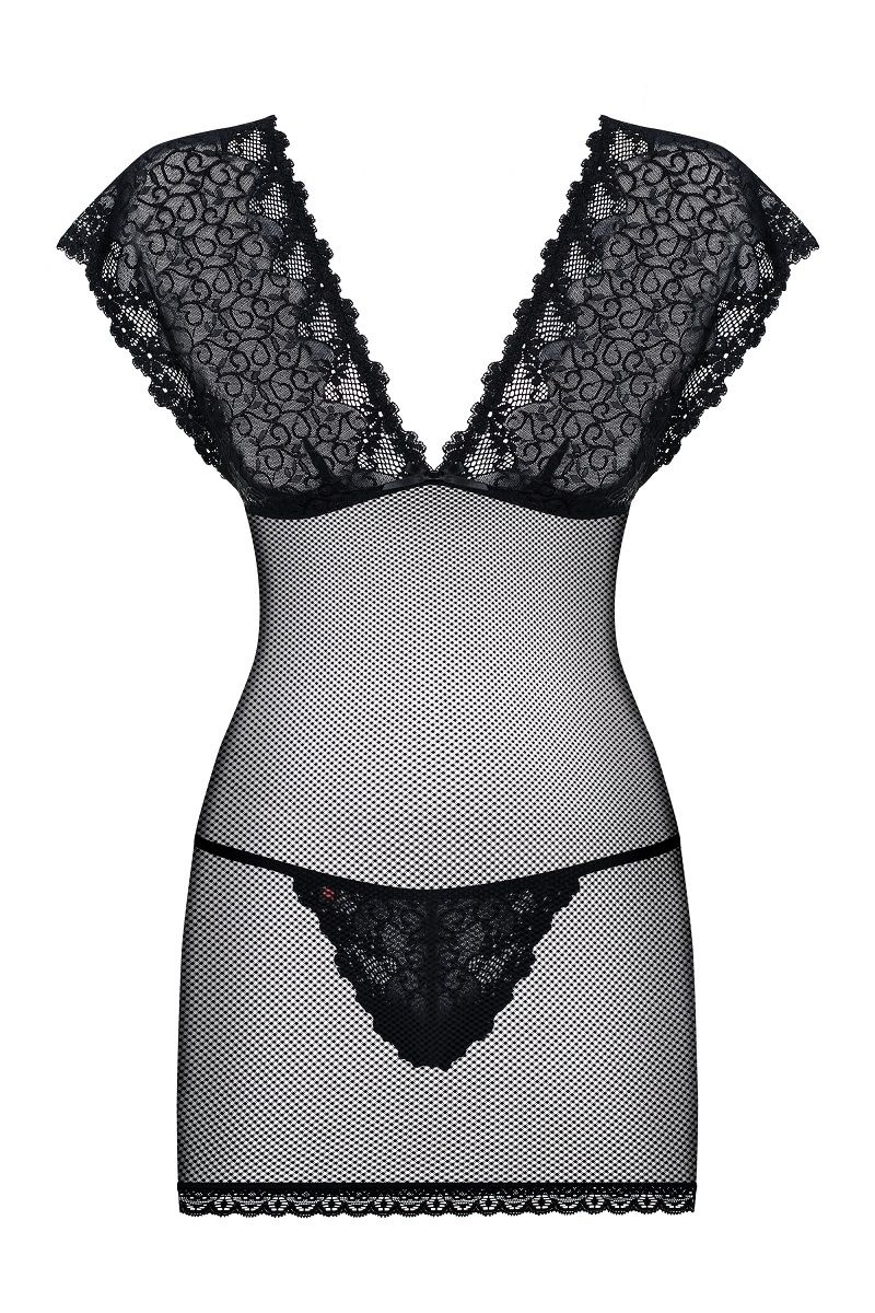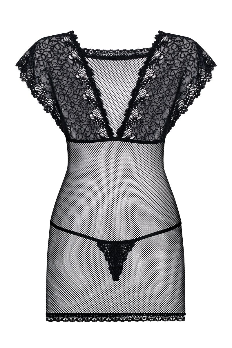 Оригинальная сорочка из сетки и кружев. плотно облегает стан, подчеркивая изгибы. Длина мини. В комплекте: сорочка, трусики-стринги.