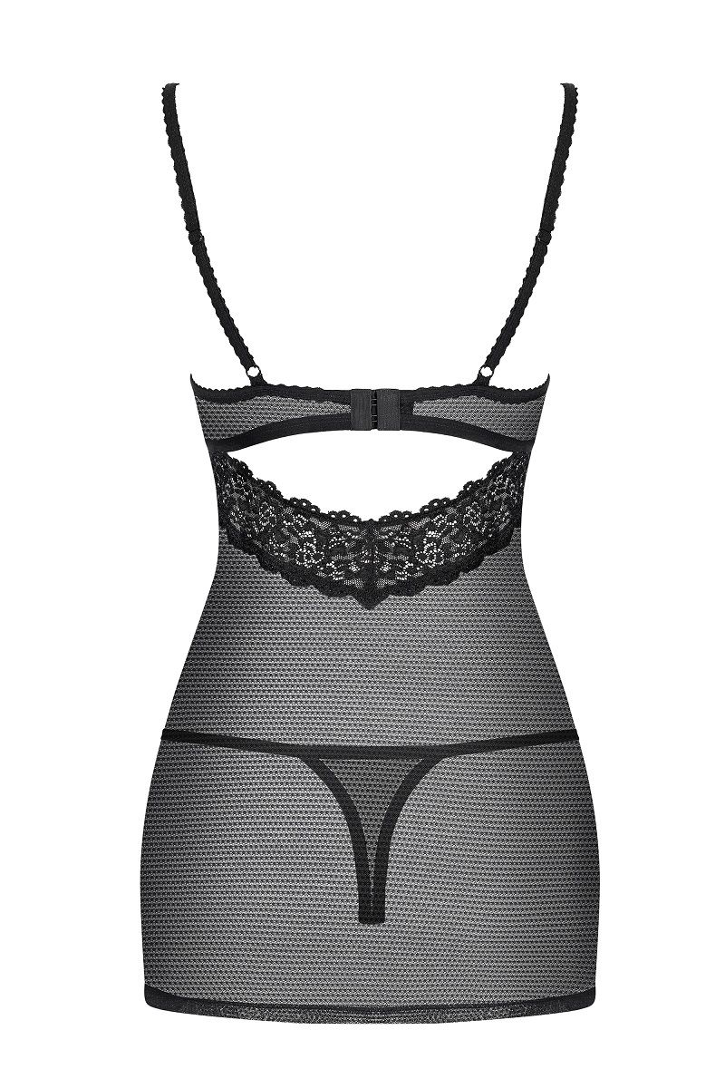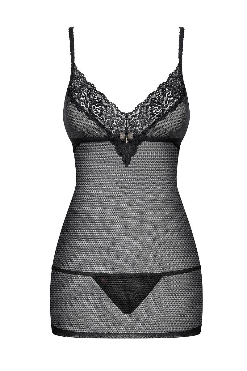 Сорочка выполнена из полупрозрачной сеточки в сочетании с отделкой из красивого кружева, бретели регулируются. В комплекте: сорочка, трусики-стринги.