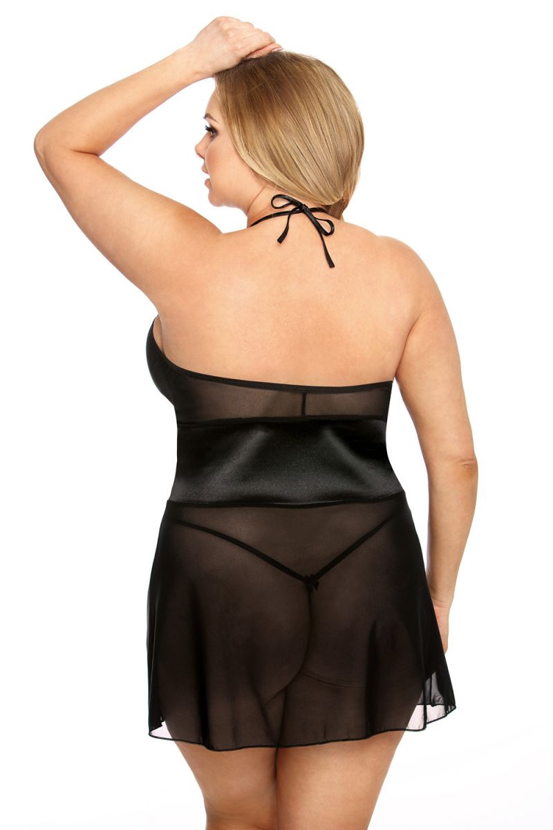Прозрачная коротенькая сорочка с декоративной шнуровкой на груди. Сорочка имеет завязки на шее. В комплекте: сорочка, трусики-стринги.