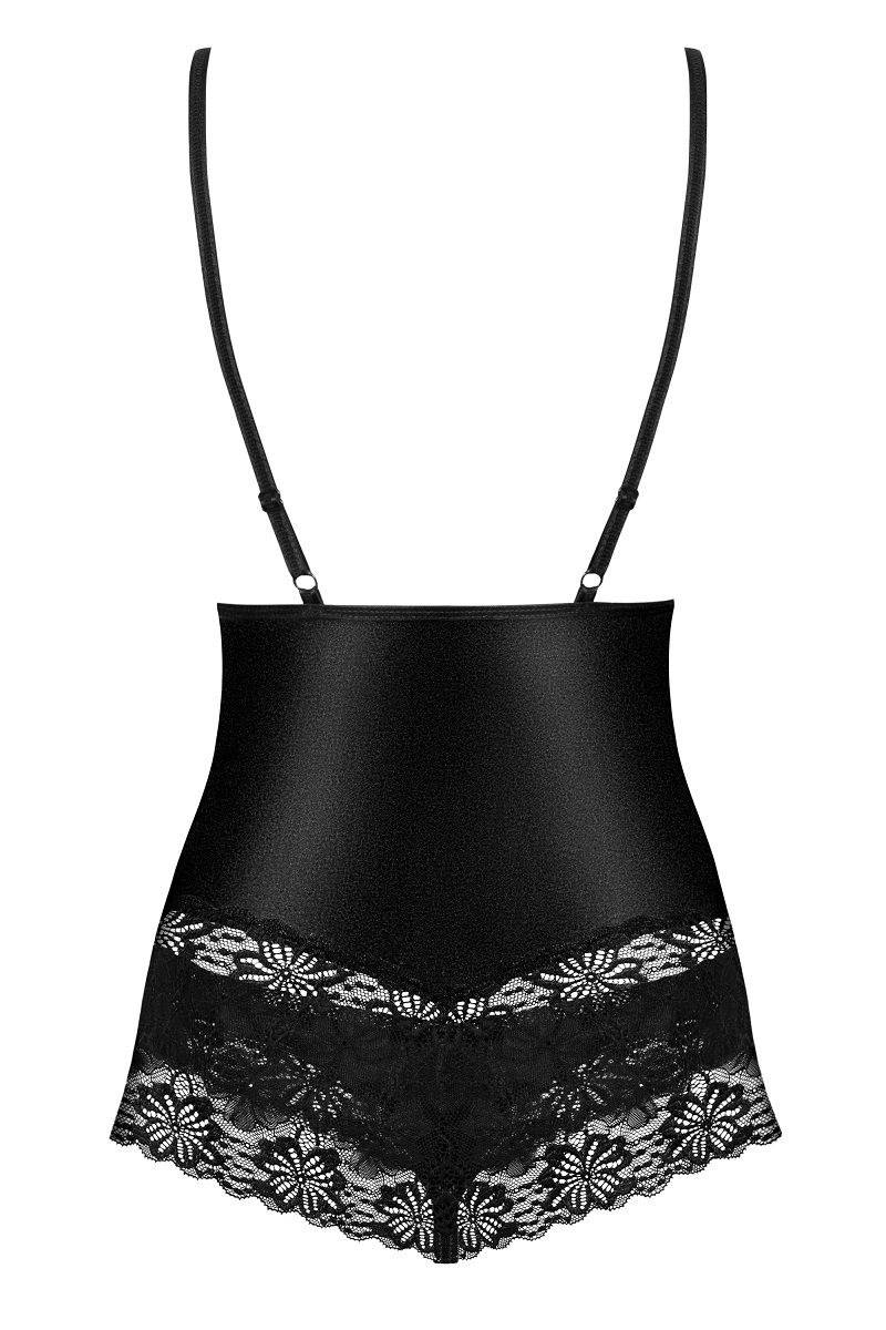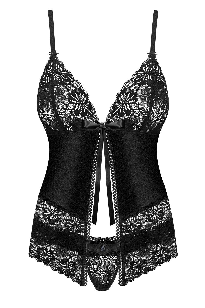 Короткий бэби-долл с открытым животом, из стрейч-атласного материала и кружева, зону декольте украшает атласная лента. В комплект входят трусики-стринги. В комплекте: сорочка, трусики-стринги.