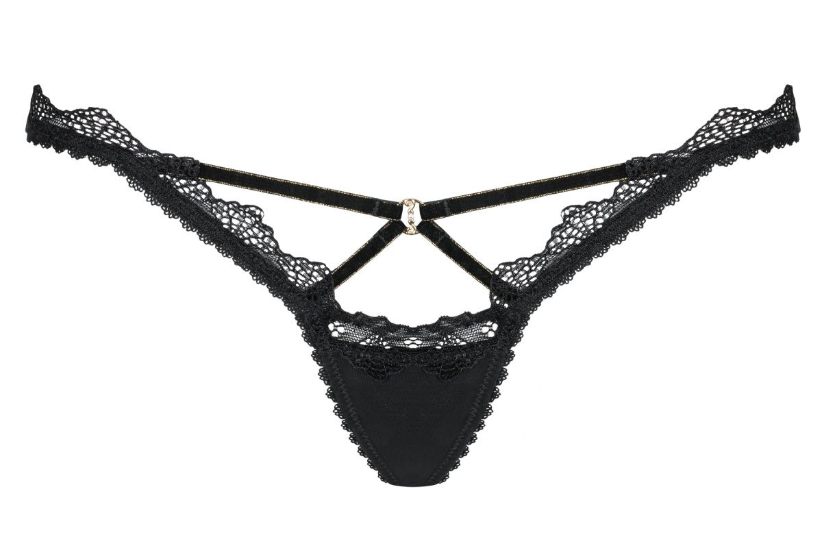Женские трусики-стринги, украшенные кружевом. Спереди оригинальные перекрещенные ремешки из бархатистой ткани, а также золотистое украшение.