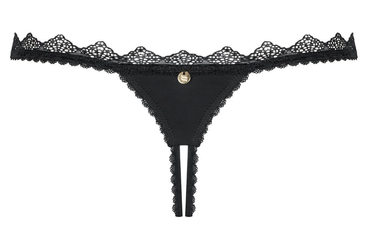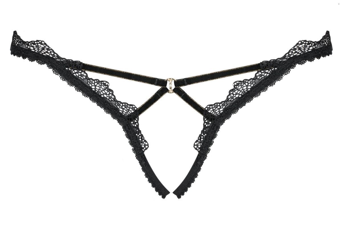 Озорные трусики с открытой промежностью. Изготовлены из тонких бархатистых ремешков и украшены кружевом. Модель декорирована круглым украшением золотистого цвета.
