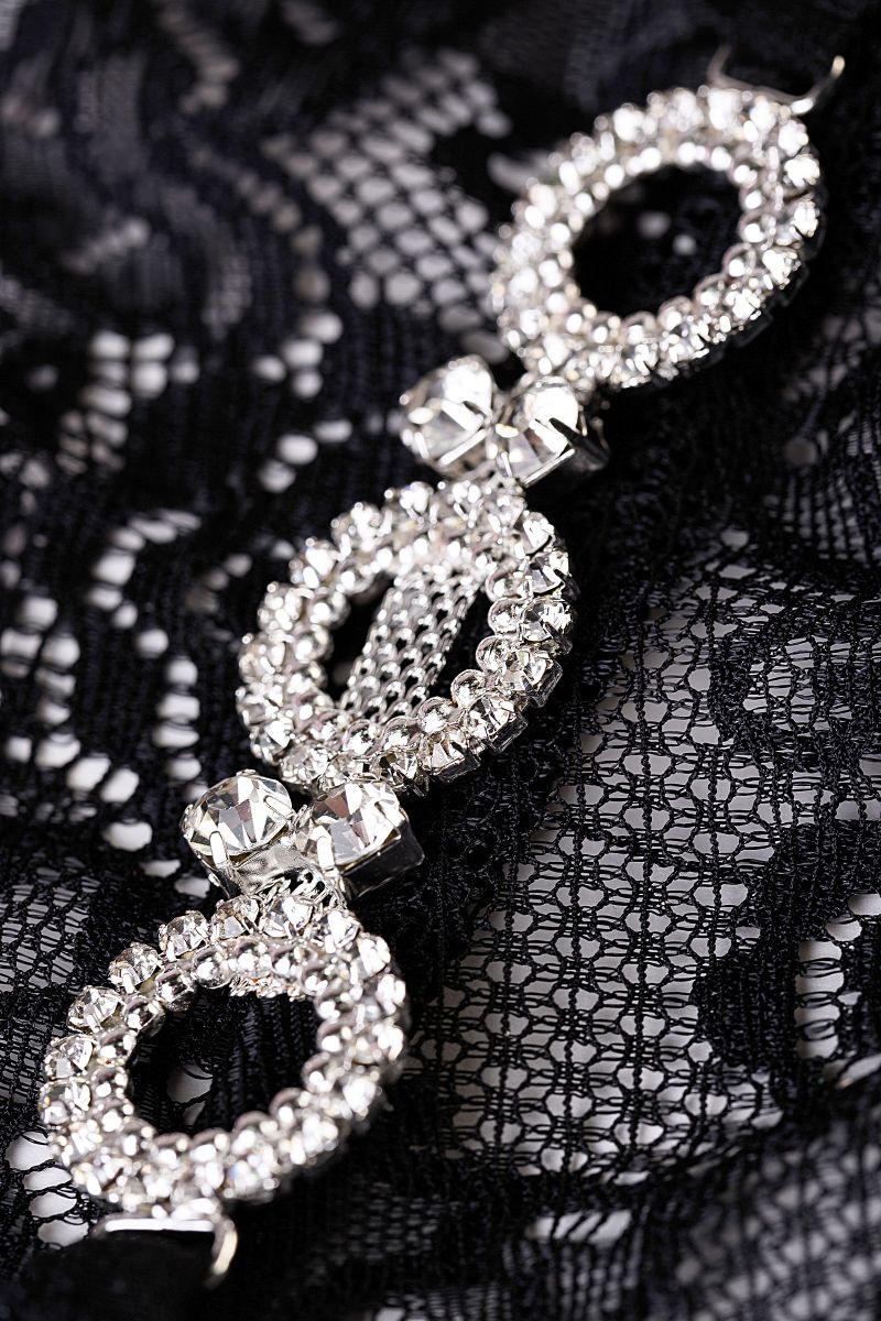 Миниатюрные трусики выполнены из кружева с цветочным орнаментом. Нежные и невесомые, с хлопковой ластовицей и мягкими лямками обеспечат комфорт своей хозяйке. Соблазнительная деталь в виде трех колец из страз на лямках добавляет роскоши в эротический образ.