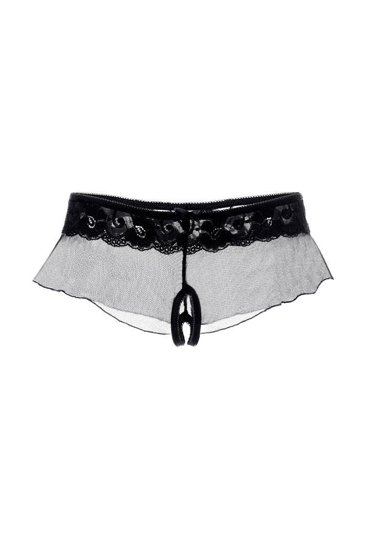 Эротические трусики-юбочка из стрейч-сетки, с кружевной кокеткой и атласным бантиком спереди.