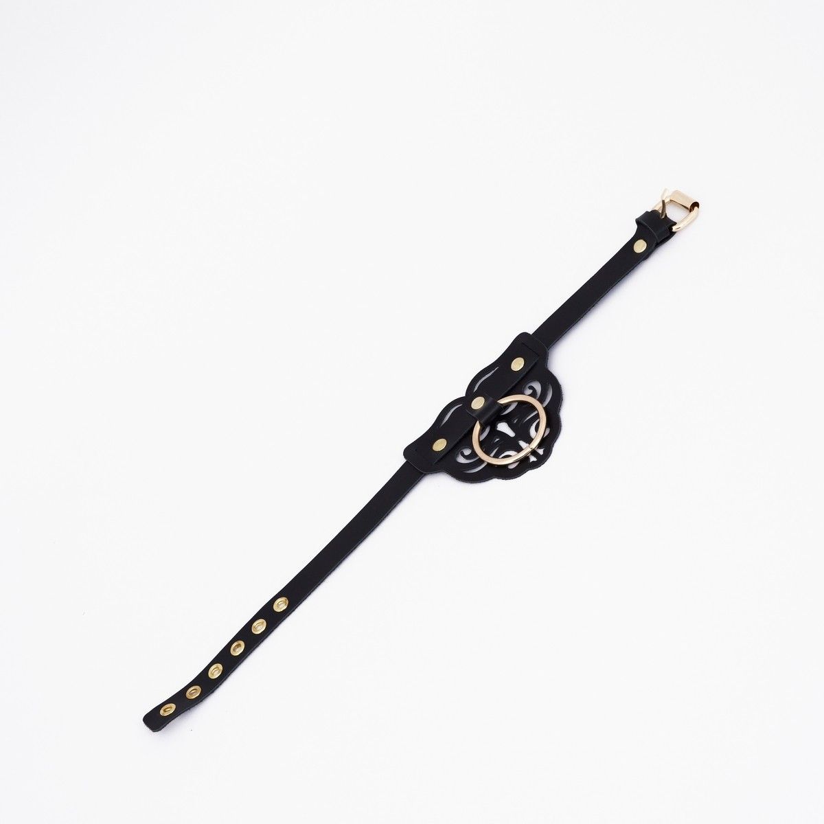 Чокер с декоративными резными узорами и клепками изготовлен из натуральной кожи. Сочетание черного цвета с золотой фурнитурой придают изделию элегантность и изысканность. Доставляется в фирменной упаковке в виде брендированной деревянной подложки.