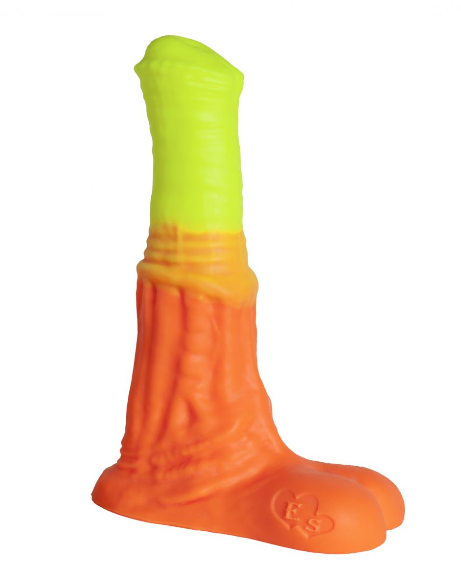 Выполненный вручную «Пегас Large+» от Erasexa – первого и пока единственного российского производителя товаров интимного назначения для поклонников зооэротики – по цвету совсем не похож на фаллос жеребца. А вот во всём остальном – ох! Приплюснутая головка с неровным краем плавно переходит в оранжево-жёлтый крупный ствол с характерным для коней кольцом посередине. Расширяясь книзу, фаллос обещает максимальное приятное растяжение стеночек вагины/ануса при проникновении. Основание с мошонкой не позволит протолкнуть силиконовую и такую приятную на ощупь игрушку слишком глубоко.