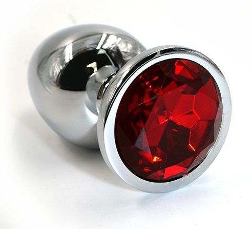 Анальная пробка из алюминия размер M. Страз в основании круглой формы, выполнен из стекла красного цвета. Упакована в вельветовый мешочек для хранения. Вес - 82,5 гр.