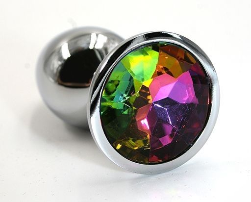 Анальная пробка из алюминия размер S. Страз в основании круглой формы, выполнен из стекла радужного цвета. Упакована в вельветовый мешочек для хранения. Вес - 52 гр.