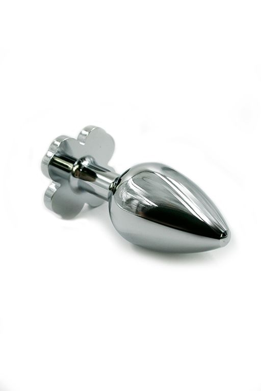 Анальная пробка из алюминия размер S. Страз в форме четырёхлистного клевера выполнен из стекла розового цвета. Упакована вельветовый мешочек для хранения. Вес - 52 гр.