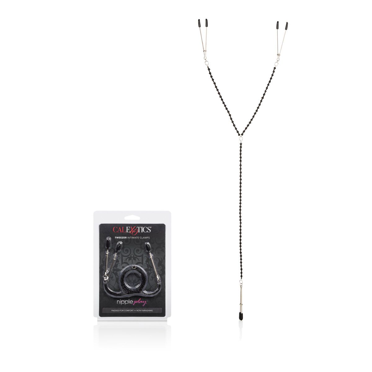 Зажимы на соски Tweezer Intimate Clamps с цепочкой служат дополнительным стимулятором одной из самых чувствительных зон. Включают в себя 3 полностью регулируемых многофункциональных зажима. Имеют мягкие наконечники, между собой зажимы соединены металлической цепью, которая одновременно служит своеобразным утяжелителем для дополнительных ощущений. Уникальный дизайн с кольцом, регулирующим натяжение. Размер каждого зажима - 7 см.