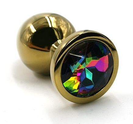 Золотая анальная пробка из алюминия размер S. Страз в основании круглой формы, выполнен из стекла радужного цвета. Упакована в вельветовый мешочек для хранения. Вес - 52 гр.