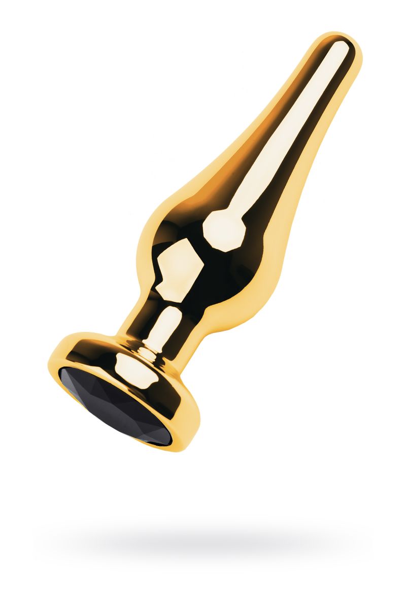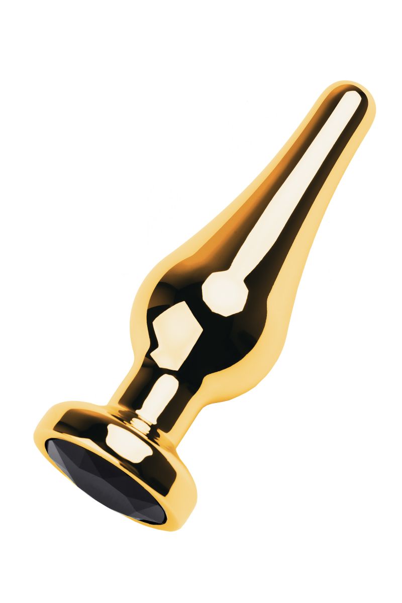 Золотистая каплевидная анальная пробка с чёрным кристаллом. Рабочая длина - 7,5 см.