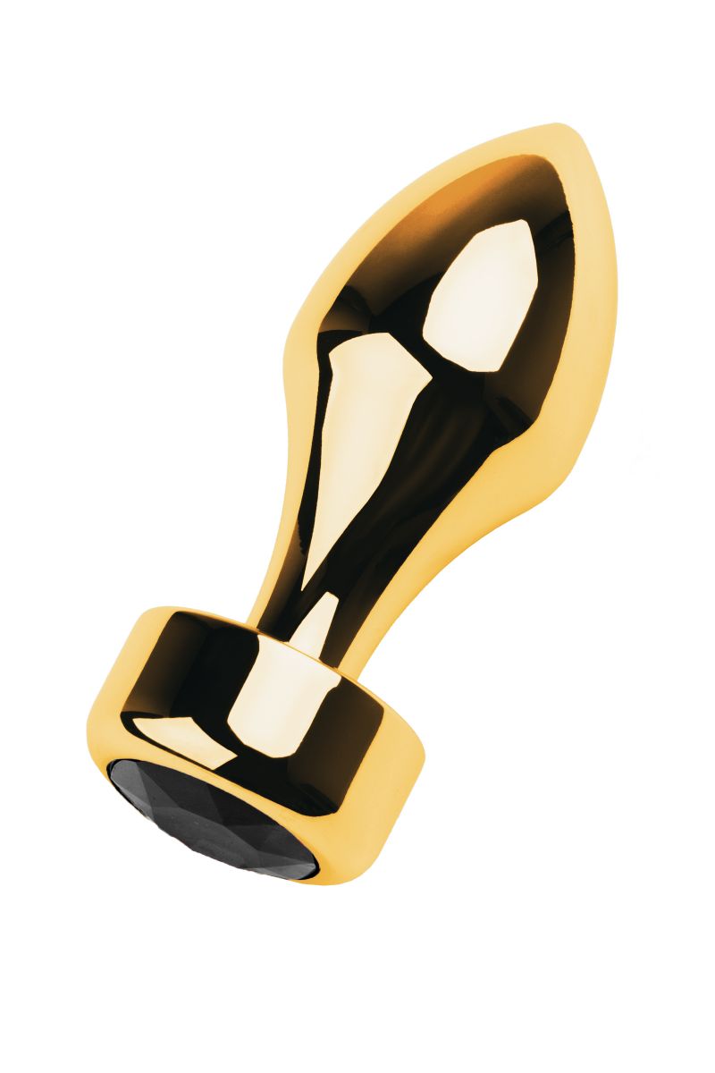 Золотистый каплевидный анальный плаг с чёрным кристаллом.