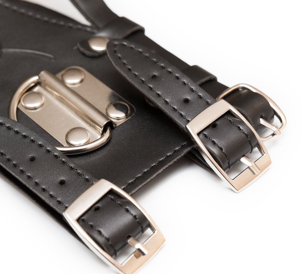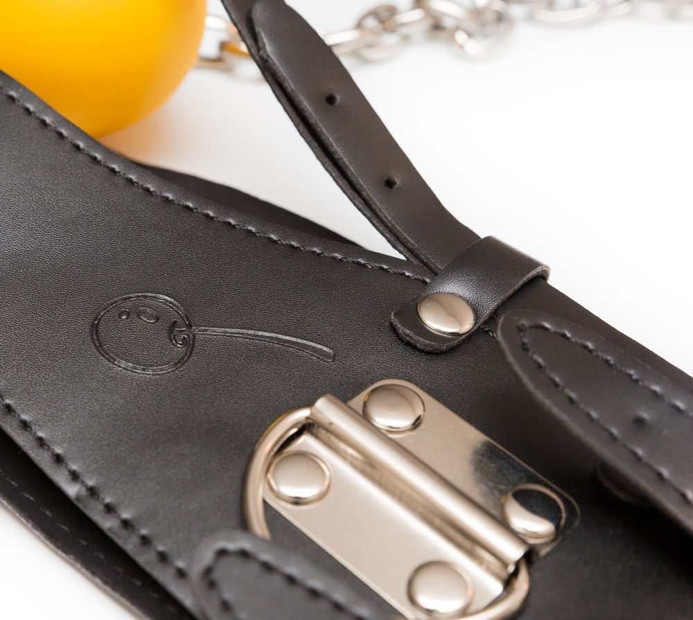 Кляп-шарик, соединенный с широким брутальным ошейником и пристегивающимся на карабин поводком. Качественное исполнение, материал - эко-кожа и безопасный пластик, декор из белого металла, удобная ручка поводка. Размер регулируется при помощи металлических пряжек.