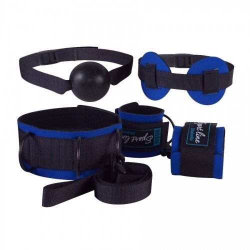 Появилось желание расширить границы сексуальных отношений и погрузиться в порочную, чувственную стихию BDSM? Оригинальный набор из 4 предметов прекрасно подойдёт для данного занятия. Набор могут смело использовать новички, так как все предметы изготовлен из мягкого, пористого неопрена, ламинированного гладким нейлоном, что предотвращает травмирование при отсутствии опыта. Искушённым участникам BDSM данный набор, также придётся по вкусу, так как использование, в конструкции изделий, пристроченной стропы, обеспечивает надёжное удерживание полуколец, что даёт возможность использовать данный набор в самых страстных ролевых играх. В набор входит: ошейник с поводком, наручники, кляп-шар и маска. Все предметы выполнены в сине-чёрной цветовой гамме. Каждый из этих предметов прекрасно сочетается друг с другом, а также, при желании, могут использоваться отдельно. Первая пара - ограничивающая подвижность, представлена ошейником и наручниками, которые имеют неопреновую основу и стропу, проходящую вдоль всего изделия. На ошейнике располагаются три полукольца, для присоединения поводка и наручников. На одном конце повода, закреплён прочный пластиковый карабин, с другой стороны имеется петля, что позволяет при необходимости освободить руки, надев его на запястье. Наручники соединяются при помощи крепкого пластикового двухстороннего карабина. В качестве застёжек выступает липкая лента, позволяющая отрегулировать изделие под любой размер. Вторая пара, ограничивает восприятие визуальных раздражителей и лишает права голоса сабмиссива. Маска с круглыми шорами, которые свободно перемещаются по стропе, даёт возможность индивидуально подогнать её, в зависимости от посадки глаз.Кляп-шар изготовлен из латекса. Маска и кляп фиксируются при помощи липкой ленты, что значительно упрощает их использование и регулировку размера. Длина поводка - 100 см. Диаметр шарика кляпа - 6 см.