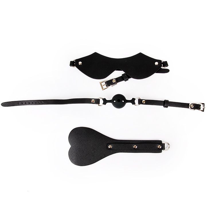 Великолепный набор аксессуаров для любителей БДСМ. В комплект входят кляп с шариком, маска, шлёпалка. Изделия имеют возможность регулирования размера. Кляп оснащён шариком с отверстиями для дыхания. Шлёпалка имеет металлическое кольцо, за которое изделие можно подвесить.