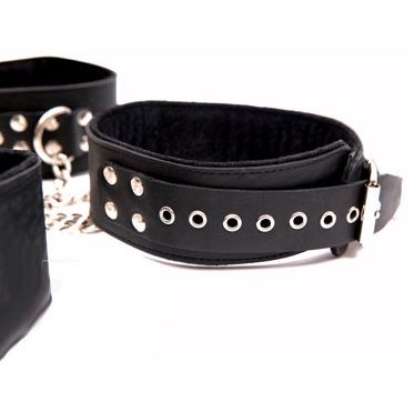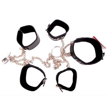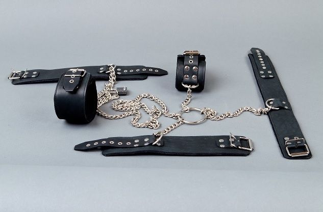 Данный бондажный комплект изготовлен из натуральной кожи высочайшего класса черного цвета. Состоит комплект из ошейника, наручей и поножей, соединенных цепью. Расстояние между поножами регулируется при помощи навесного замочка. Минимальный обхват поножей - 23 см., максимальный - 31 см.