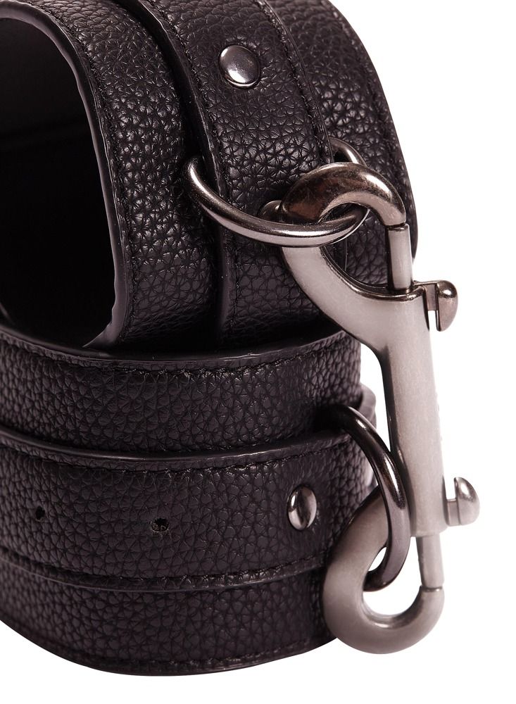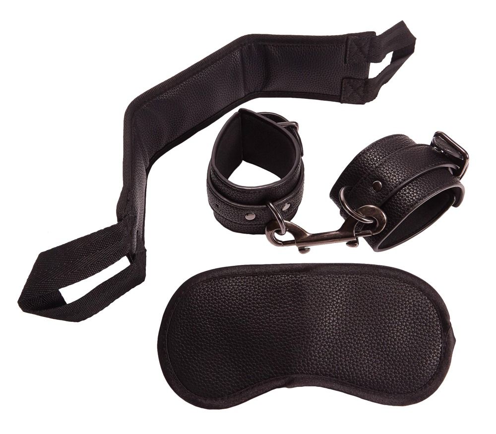 Набор состоит из маски на глаза с эластичной лентой, регулируемых по диаметру наручников с карабинным крючком и ремня с ручками. Выполнен из мягкой искусственной кожи в классическом черном цвете. С помощью ремня с ручками вы сможете контролировать глубину и частоту проникновения во время минета, или изгиб тела вашей партнерши, все зависит только от вашей фантазии. Длина маски - 18 см., ширина - 8 см. Высота манжет наручников - 7 см. Длина поддерживающей повязки - 52 см., ширина - 7 см.