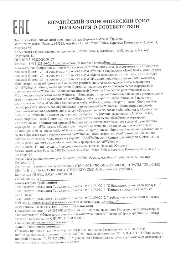 Биогенный комплекс растительных экстрактов Erotichard male power в капсулах с пантогематогеном – это натуральный, негормональный продукт, направленный на нормализацию работы мужской репродуктивной системы. Мощнейшие афродизиаки и адаптогены в составе биологически активной добавки способствуют: -усилению сексуального влечения -повышению половой активности -увеличению продолжительности эрекции -снятию усталости -устранению нарушений потенции, имеющих психогенное происхождение -активизации синтеза гормонов, влияющих на выработку свободного тестостерона -улучшению кровоснабжения в сосудах и пещеристых телах полового члена, обеспечивая стабильную эрекцию -улучшению качества спермы — увеличивая концентрацию активных сперматозоидов, повышая вероятность зачатия -предупреждению развития заболеваний мочеполовой системы, предстательной железы, повышая общие защитные функции организма -более яркому процессу прелюдии и самому половому акту за счет активизации эрогенных зон малого таза -усилению приятных эмоций в момент оргазма -повышению общей выносливости, что дает возможность увеличить продолжительность полового акта -укреплению организма, сокращая промежуток перерыва между половыми актами. Положительный эффект обеспечивают входящие в состав компоненты растительного происхождения. Капсулы благотворно воздействуют на половую функцию, повышают либидо, являются профилактикой воспалительных и инфекционных заболеваний мочеполовой системы, а также улучшают настроение, повышают работоспособность и уменьшают депрессивные состояния. Противопоказания: не рекомендуется лицам, страдающим индивидуальной непереносимостью компонентов, повышенной нервной возбудимостью, бессонницей, артериальной гипертензией не рекомендуется превышать рекомендуемую суточную норму продукта (2 капсулы) противопоказан одновременный прием с алкоголем, т.к. снижает эффективность действующих веществ. Прием капсул возможен за 30-40 минут до употребления алкоголя. При заболеваниях сердечно-сосудистой системы совместный прием с алкоголем исключен.