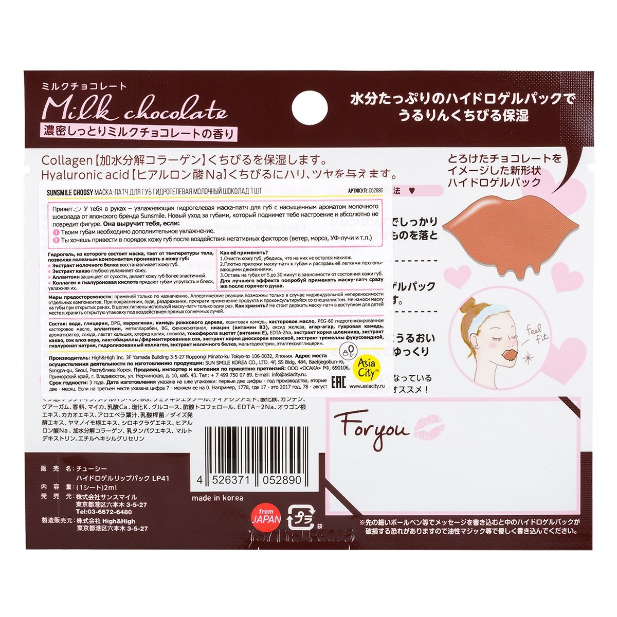Восстанавливающая гидрогелевая маска-патч для губ с ароматом нежного Молочного шоколада от японского бренда SunSmile. Новый уход за губами, который поднимет тебе настроение и абсолютно не повредит фигуре. Подходит если необходимо дополнительное увлажнение или ты хочешь защитить кожу губ от шелушения и огрубения. Гидрогель, из которого состоит маска, тает от температуры тела, позволяя полезным компонентам проникать в кожу губ: защищает губы от шелушения и огрубения, разглаживая их рельеф, увлажняет кожу губ, делает кожу губ более эластичной. Коллаген и гиалуроновая кислота придают губам упругость и блеск.