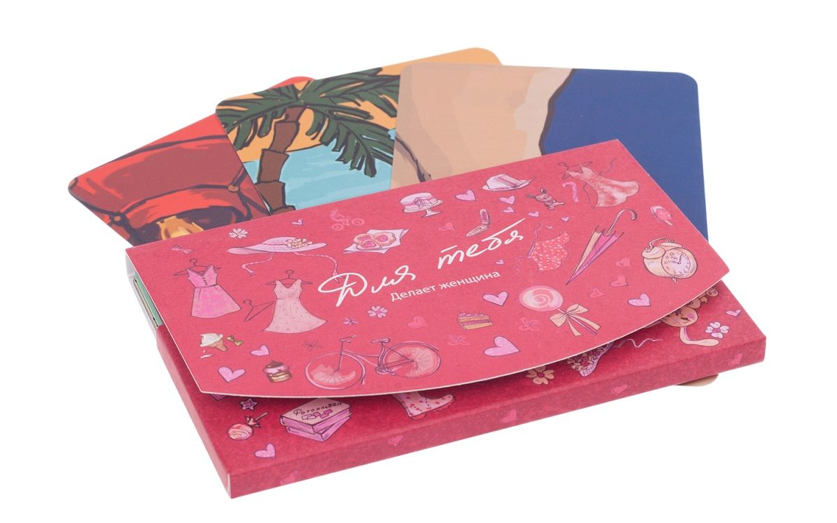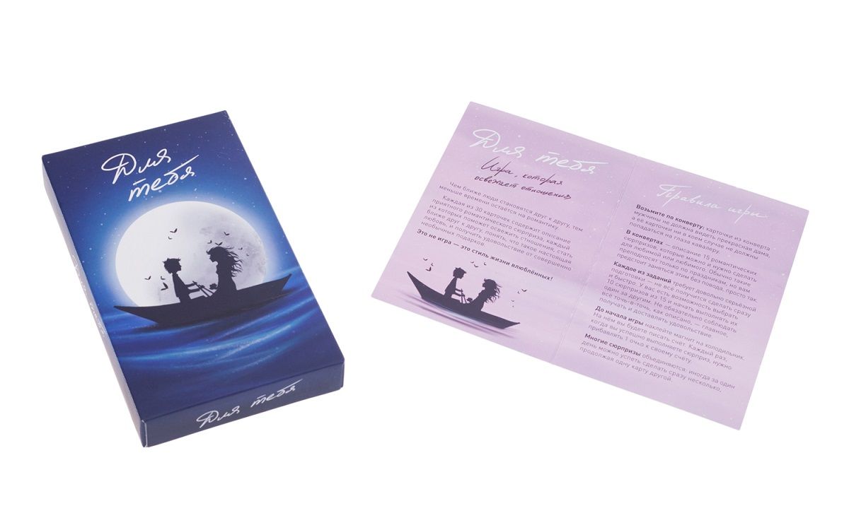 Страстно, как на первом свидании Эта игра — одна из самых необычных в нашем магазине: Партия длится 2-3 недели как минимум Игра может быть сыграна только один раз в жизни Это умная и очень красивая игра для влюбленных пар Всё в игре очень романтично и волшебно. Игра «Для тебя» вернёт уже давно живущей вместе паре страстные и живые ощущения первых месяцев ухаживаний и встреч, а для молодой пары станет подарком, который сделает отношения невероятно сильными. Как второй медовый месяц После того, как вы попробуете «Для тебя», вы поймёте, что ваш первый медовый месяц не был столь интересен и романтичен, как та игра, которая началась между вами сейчас. Просто теперь всё по-другому. Теперь вы не просто наслаждаетесь друг другом и совместно проведённым временем, а делаете то, на что никогда не решились бы, не будь этой игры. Что же это за невероятная коробка? Как играть? Внутри коробки вы найдёте два запечатанных конверта. Каждый из них содержит по 15 заданий для любимой и для любимого: Нельзя никому показывать свои задания Каждое задание — сюрприз К заданиям нужно готовиться, а потом преподносить их как волшебные подарки Игра сочетает в себе как сложные фанты, так и волнительный набор приключений: ближайшее время у вас совершенно не будет вставать вопрос как отдохнуть Если игра перевернёт вашу жизнь — мы не виноваты. Какие бывают задания? О, они самые разные, но каждое из них обязательно запомнится на долгие годы. Если вы, конечно, решитесь его сделать. На карточке задания есть как описание романтического сюрприза, так и подробная инструкция, как его выполнить. А ещё — полезные советы, «фишечки» и другие небольшие радости, которые делают даже обычные вещи невероятно красивыми. Некоторые задания потребуют от вас затрат для подготовки, но, опять же, их можно пропускать, ведь сделать нужно 10 из 15. Кому стоит подарить эту игру? Семейной паре на годовщину свадьбы или на другой праздник Молодожёнам на свадьбу или после медового месяца Парню и девушке, которые начали встречаться Как определяется победитель? Формально, в игре «Для тебя» можно выиграть: каждое выполненное задание отмечается мелком на специальном магните на холодильнике. Но, конечно же, если вы просто начнёте играть, выиграете вы, ваши отношения и ваше совместное счастливое будущее. Можно увидеть пример задания из игры или хотя бы крупную фотографию карточки? Суть игры как раз в том, что задания — это сюрпризы, поэтому примеров прямо из игры быть не может. Хотя, конечно, на фотографиях ниже можно разглядеть карточки :) Ладно, а хотя бы на что похожи задания? Они бывают самые разные: от очень простых, вроде приятного романтического подарка с особой атмосферой, до достаточно сложных или требующих некоторых трат. Многие сюрпризы — это те вещи, о которых мечтает каждая женщина и каждый мужчина, но редко дожидаются, потому что их «половинка» даже не знает о том, что так стоит сделать. В общем, если вы хотите освежить и укрепить отношения и при этом готовы приложить максимум сил ради радости, романтики и выполнения совершенно необычных вещей, то эта игра для вас. Насколько интимны сюрпризы? Есть и по одному «лёгкому» интимному заданию, но учитывая, что нужно сделать 10 из 15, их можно пропустить. В целом в конвертах нет ни одного сюрприза, который мог бы показаться слишком фривольным: это умная и оч