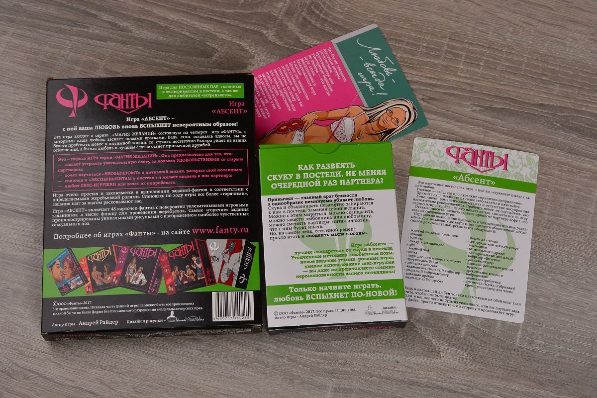 Готовы к удовольствиям? Вы когда-нибудь мечтали по-настоящему потерять голову? С коробкой фантов «Абсент» это очень просто сделать: достаточно выключить голову и начать выполнять задания. Все это вы уже видели в кино, а часть, вероятно, даже пробовали. Но ведь каждое эротическое приключение совершенно уникально! Так что смело открывайте коробку и начинайте... получать удовольствие. Секрет для двоих Производители предлагают начать игру в кровати. Но учтите, далеко не все задания вы сможете выполнить тут же. Некоторые растянутся на несколько дней, украсив серые будни ожиданием эротического праздника. Клубника, шампанское, поцелуи Насколько неприлична эта игра? Ровно настолько, насколько может быть раскованным в постели. Если вы готовы только слегка пошалить, то берите самые безобидные задания — фанты белого и желтого цвета. Если же вы готовы удивляться и удивлять, а также пробовать новое, необычное и оттого еще более возбуждающее — смело тяните розовые и красные карточки. Готовьте инвентарь Среди фантов попадаются задания, для выполнения которых потребуются особые предметы. Есть совсем простые и привычные, а есть те, что в обычном супермаркете не купишь. Так что разыграв половину колоду, вполне вероятно, вы захотите большего и отправитесь в секс-шоп за любопытными игрушками. Впрочем, это совсем необязательно, чтобы получить удовольствие от игры. Все зависит только от ваших желаний. Кто не устоит перед искушением? Любители «погорячее»: все те, кто давно мечтал попробовать, но еще не успел Настоящие игроки: что может быть увлекательнее, чем играть в постели? При этом выигрыш — гарантирован. Пары, уже попробовавшие многое: готовы к новым экспериментам? Разве нужен повод? Скоро годовщина? Откажитесь от дежурных подарков в пользу Фантов-Абсент, которые сделают счастливыми вас обоих День Святого Валентина: этому подарку он точно будет рад. Впрочем, не меньше, чем она. Волшебный набор: 48 карточек с заданиями разной степени эротичности фишка для жеребьевки (кто будет тянуть фант) правила игры с рекомендациями по проведению увлекательного вечера подсказки по позам.