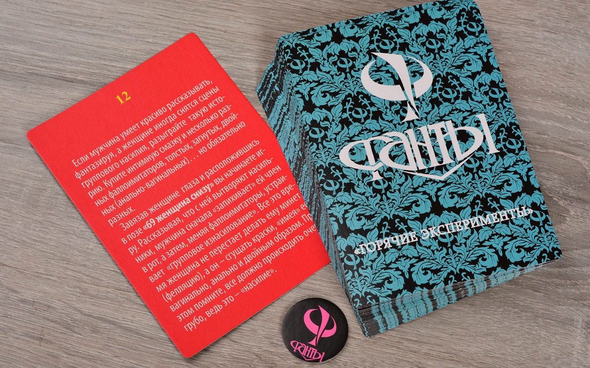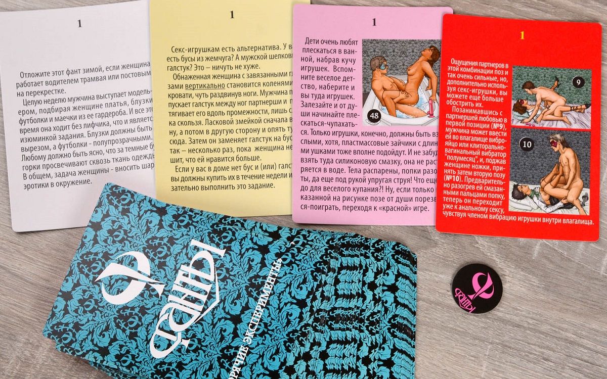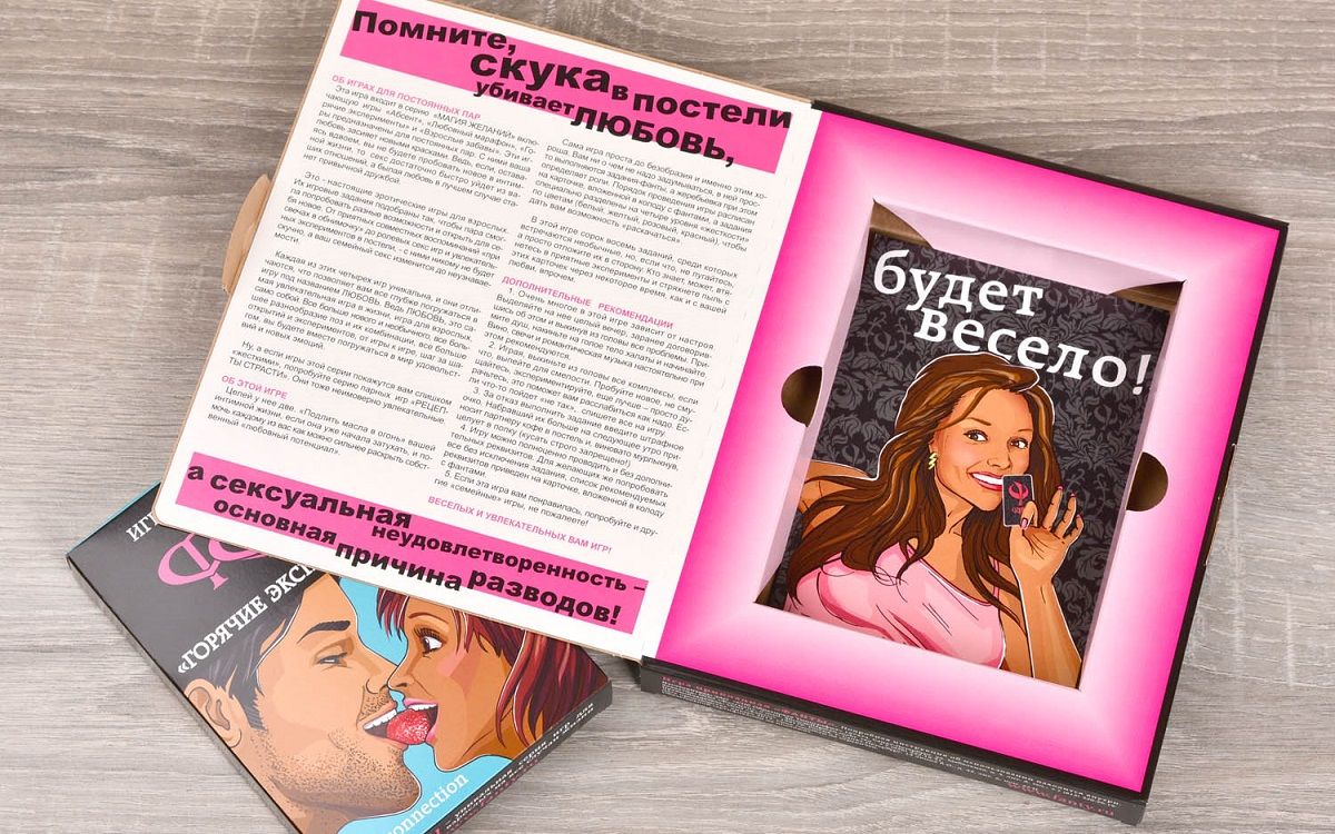 Масса новых ощущений Если вы достаточно честны, чтобы признаться, что пробовали в постели еще не все. Если вы достаточно отважны, чтобы признаться, что многое попробовать хочется. Если у вас есть возлюбленная готовая к экспериментам так же, как и вы, то пора открывать эту коробку. Вы готовы на все? Фанты «Горячие эксперименты» — это увлекательная сексуальная игра, в которой накал страстей медленно нарастает. Сначала вы тянете белые, довольно невинные, карточки с заданиями, потихоньку входя во вкус. Затем наступает очередь желтых фантов — чуть более откровенных. И, наконец, когда вы уже довольно раскрепощены, пора переходить к розовым заданиям, которые уже предлагают много интересных занятий для пары. Решитесь ли вы на самые развязные, красные, фанты? А почему бы и нет — ведь влюбленным можно все. А если нет? Вас ждет множество сюрпризов, некоторые из которых могут оказаться... слишком волнующими. Перед тем, как начать играть, внимательно изучите карточки и подумайте, на что ваш партнер с радостью согласится, а что может показаться ему слегка сомнительным. Отложите несколько штук на будущее, войдете во вкус, и тогда они вам обязательно пригодятся. Многообещающий красный Большинство «красных» заданий предлагает попробовать различные секс-эксперименты с дополнительными предметами. И не просто предлагает, а рассказывает и даже показывает, как получить от них максимум удовольствия. На фантах есть не только письменные рекомендации, но и весьма познавательные иллюстрации. В игре: 48 карточек-фантов с заданиями фишка, определяющая, кто тянет следующий фант правила игры с деликатными рекомендациями.