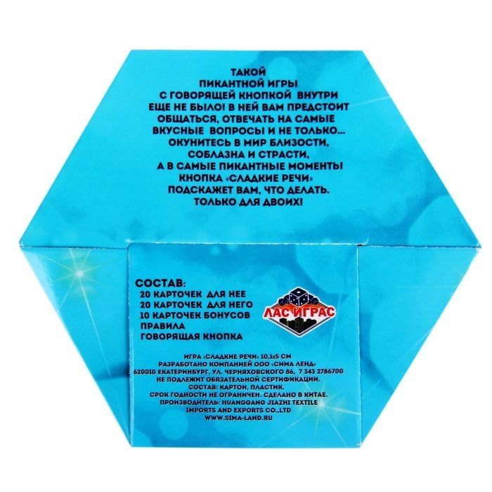 Игра для двоих с пикантной говорящей кнопкой. Узнайте самые интимные секреты друг друга — эта соблазнительная игра добавит в ваши отношения «перчинку». Вам предстоит ответить на самые откровенные вопросы! В игре вы найдёте колоду карт «Для него» и «Для неё», а также кнопку с изображением леденца. По очереди с партнёром тяните карту из своей колоды и откровенно отвечайте на пикантные вопросы. Если в вашей колоде попалась коварная бонусная карта — нажмите говорящую кнопку, и сладкий голос подскажет вам задание. Узнавайте друг друга, дарите партнёру страстные поцелуи… В наборе: 50 карточек говорящая кнопка правила игры.