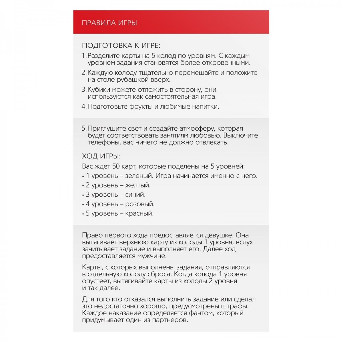 Если бы вы знали, что завтра конец света и это именно тот день, когда можно воплотить в жизнь свою самую смелую сексуальную фантазию, чего бы вам хотелось? При помощи этой игры вы сможете воплотить все тайные желания друг друга! И как играть в эту игру? Все очень просто! В игре 5 уровней: начинайте с карточек первого уровня, а затем по очереди вытягивайте по одной, зачитывайте задание и выполняйте его. Когда колода заканчивается, переходим ко второму уровню, формируем новую колоду и так до конца игры. Задания усложняются от уровня к уровню: если на первом вы общаетесь и раскрепощаетесь, рассказывая друг другу о самых эротичных местах на теле партнера, о ваших сексуальных фантазиях, то впоследствии вы их воплощаете и от легкого флирта переходите к нежным предварительным ласкам, ролевым играм и... необузданная страсть переполняет вас! В игре предусмотрены штрафы, каждое наказание определяется фантом. Для кого эта игра? - Для тех, кто хочет разнообразить свою сексуальную жизнь: для сложившихся семейных пар! - Это отличный подарок для ваших друзей и подруг: они будут благодарны вам после того, как опробуют игру! - Для молодоженов - игра поспособствует усилению страсти, «медовый» месяц будет еще ярче и запомнится надолго! - Для смелых экспериментаторов, которые готовы к новым образам и ярким приключениям! - Отлично подойдет для недавно встречающихся пар: начиная с более легкого уровня, вы будете продвигаться постепенно к более сложным и усиливать ваше влечение, укрепляя отношения. Что входит в игру? - 53 карточки-фанты разных цветов. - Секс-кубики. - Инструкция к игре.