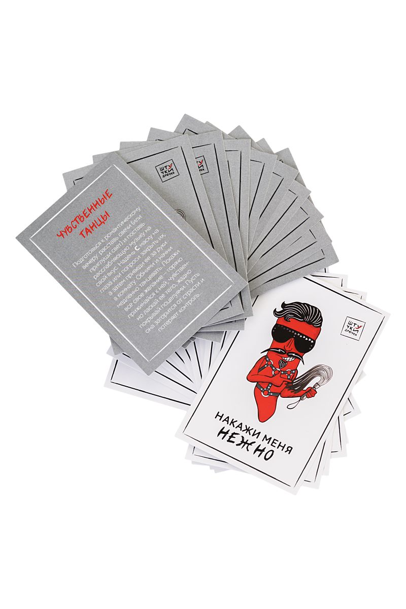 Игра Накажи меня нежно — то, что нужно, если вы давно поглядываете в сторону БДСМ, но стесняетесь. Если хочется добавить огня в секс, но не хватает идей. Игра в стиле БДСМ от Штучек-Дрючек для тех, кто мечтает о смелых ролевых играх, когда все фантазии сводятся к костюму супергероя или кошечки. Внутри коробки все, что нужно для первого знакомства с БДСМ: карточки со сценариями и аксессуары к ним. Первые помогут определиться с ролью и не бояться, а вторые воплотят в жизнь все желания и доставят максимум удовольствия. Вам понравится, обещаем! В комплекте: маска, наручники, оковы, ошейник с поводком, флоггер, кляп, веревка, контракт, 20 карточек со сценариями. Ширина маски – 19 см. Диаметр кляпа-шара - 4 см. Длина ремешка кляпа – 63 см. Длина манжет наручников - 27 см. Длина манжет оков – 32 см. Длина ошейника – 44 см. Длина поводка ошейника – 110 см. Длина веревки - 500 см. Длина флоггера - 49 см.