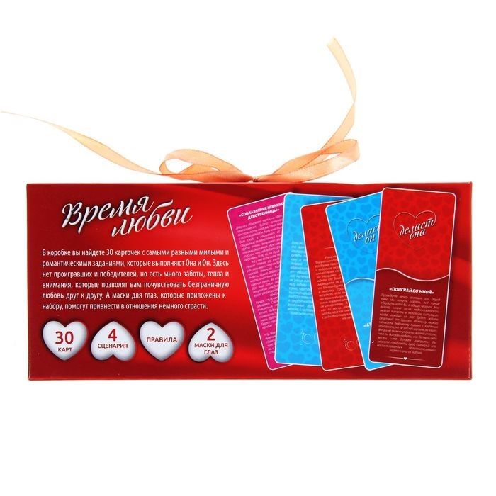 Погрузитесь в атмосферу романтики и нежности… Ведите свой счёт успешных сюрпризов, даря своему любимому человеку незабываемые эмоции. Мы предлагаем вам расширить границы любви и напомнить друг другу о теплоте чувств.В этой игре нет проигравших и победителей, но есть много заботы, ласки и внимания. В наборе вы найдёте 30 карточек, 15 из них предназначены для неё, а другие 15 — для него. Задания, подобранные для каждой половинки, сотканы из самых нежных чувств. Воплощая в реальность эти несложные замыслы, вы наполните ваши отношения яркими эмоциями и любовью. Очень важно не подглядывать в карточки друг друга, так сюрпризы получатся ещё более неожиданными и приятными! Для исполнения некоторых заданий вам понадобятся маски для глаз, они приложены к набору, а бонусом будут являться сценарии ролевых игр! В комплекте: 30 карт, 4 сценария, правила, 2 маски для глаз.