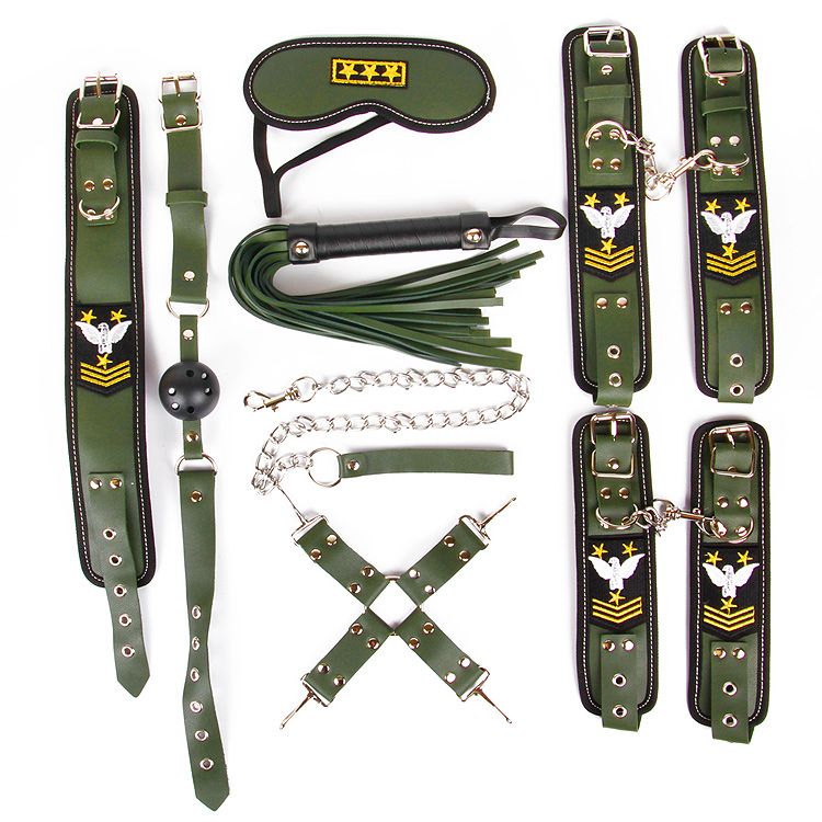 Великолепный набор аксессуаров для любителей БДСМ. В комплект входят наручники, оковы, ошейник с цепочкой-поводком, фиксатор, плеть, кляп, маска. Наручники, оковы, ошейник и маска снабжены специальной внутренней накладкой, предотвращающей натирание кожи. Также изделия имеют возможность регулирования размера. Плеть-флоггер состоит из хвостов и удобной рукоятки с металлическими вставками и петлёй для подвешивания на крючок. Кляп оснащён шариком с отверстиями для дыхания. Набор украшен декоративными накладками в военной тематике, упакован в большие красивые коробки.