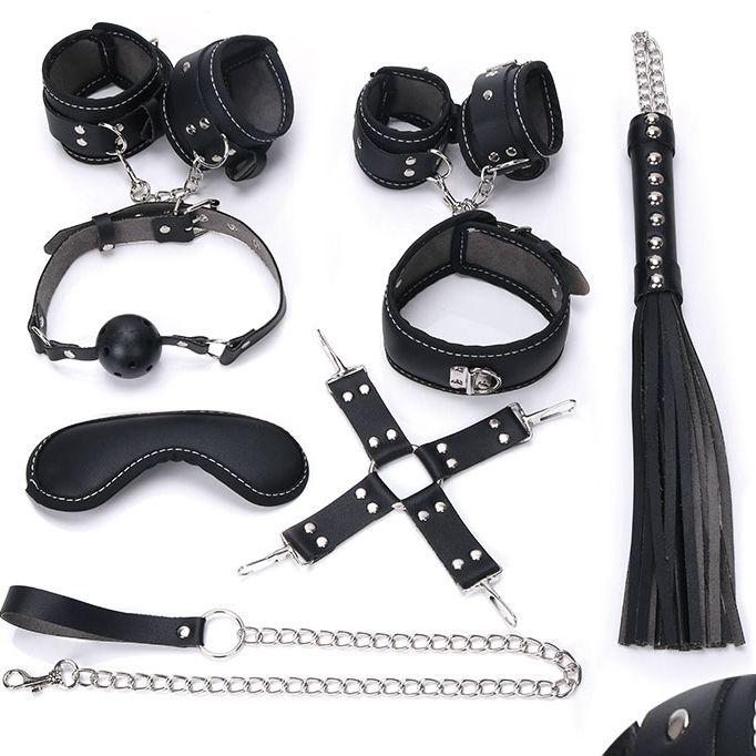Великолепный набор аксессуаров для любителей БДСМ. В комплект входят наручники, оковы, ошейник с цепочкой-поводком, фиксатор, плетка, кляп, маска. Кляп, наручники, оковы, ошейник и маска снабжены специальной внутренней накладкой, предотвращающей натирание кожи. Также изделия имеют возможность регулирования размера. Плеть-флоггер состоит из хвостов и удобной рукоятки с металлическими вставками и петлей для подвешивания на крючок. Кляп оснащен шариком с отверстиями для дыхания.