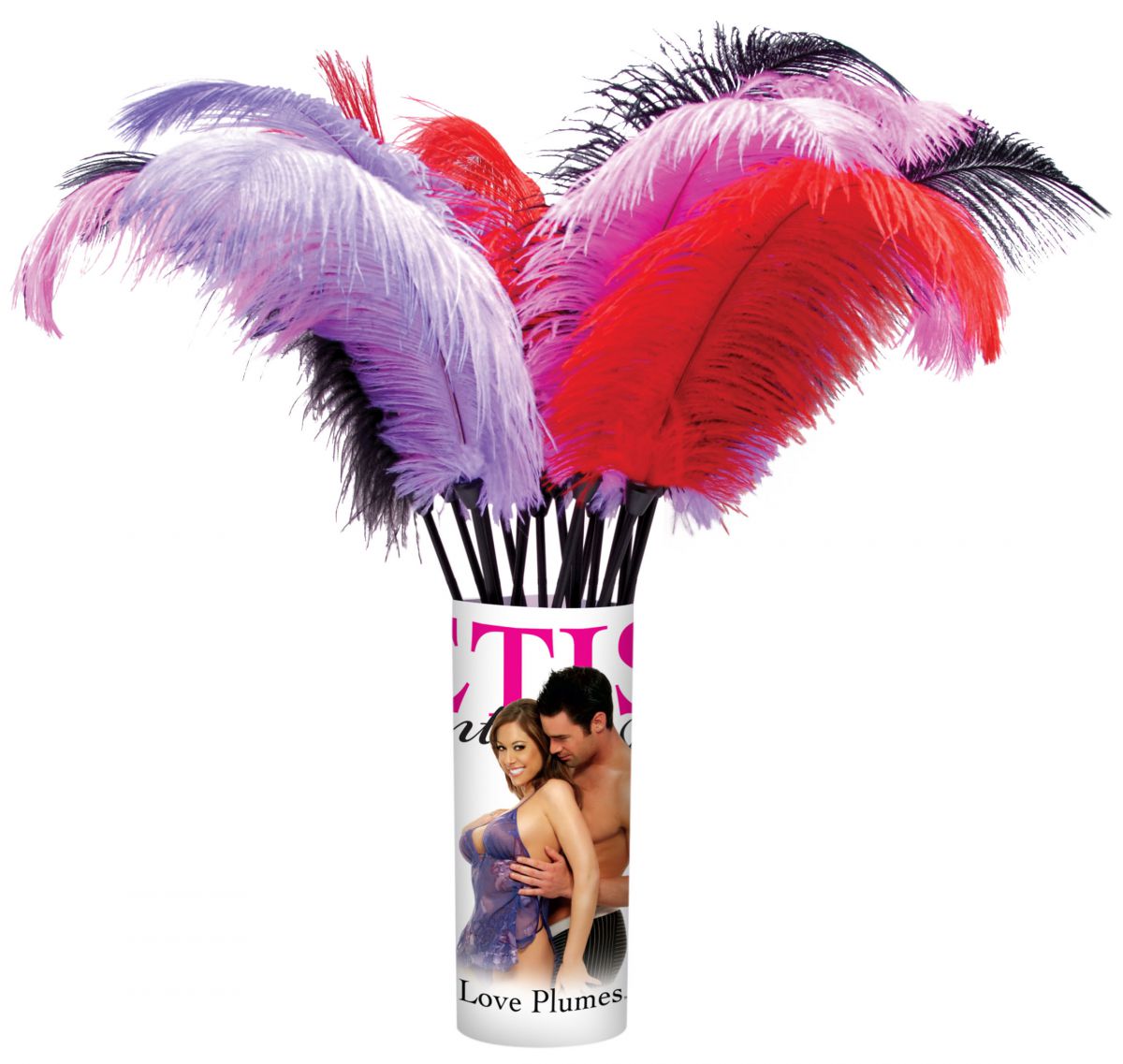 Набор из 12 перьев для любовных игр разных цветов (красный, розовый, черный, фиолетовый).