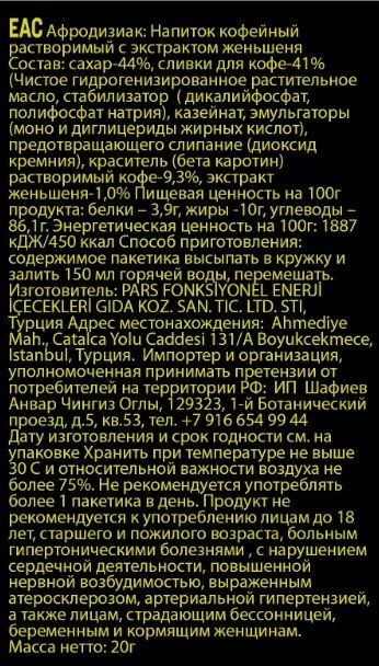 Растворимый кофе, полученный из корней растений, со специальной рецептурой и с лучшим возбуждающим эффектом активного ингредиента-афродизиака. Продукты 48 hours gold - натуральные ингредиенты моментального действия для повышения потенции и яркого оргазма. Уникальность 48 hours gold в том, что продукт стимулирует сексуальную энергию как мужчин, так и женщин, повышая чувствительность обоих партнеров. Гарантированное действие 48 hours gold обусловлено высоким содержанием основного компонента - экстракта женьшеня. Женьшень во взаимодействии с другими компонентами улучшает микроциркуляцию, повышает либидо и обеспечивает устойчивую эрекцию. Продукт воздействует сразу и имеет пролонгированное действие , поэтому обеспечивает продолжительность полового акта и яркий оргазм партнеров.