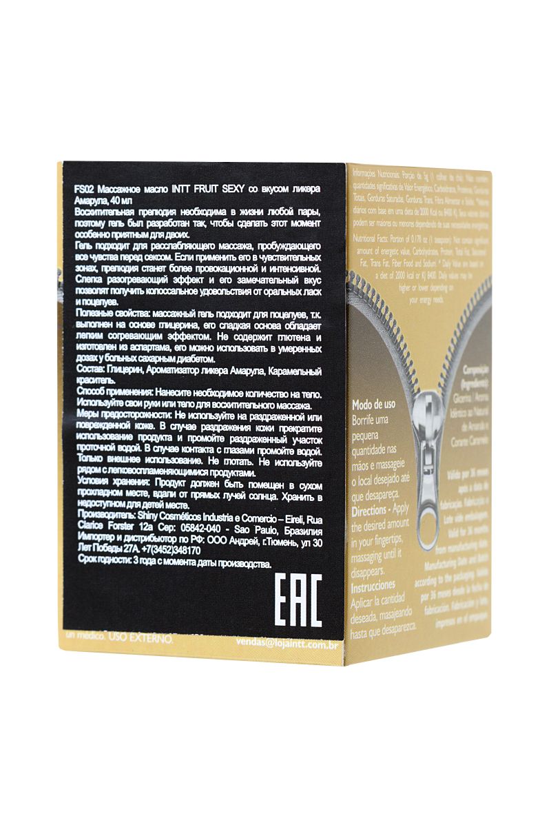 Искра. Буря. Экстаз. Может ли массаж подарить такое? Может, если это массажное масло для поцелуев Intt Fruit Sexy с ароматом ликера Амарула. Позволяет экспериментировать. Поскольку масло обладает разогревающим эффектом и предназначено для поцелуев, можно не ограничивать себя в сценариях интимных игр. Нанесите Intt Fruit Sexy на тело, поцелуйте несколько чувствительных точек и подуйте на них в течение 3 секунд — возбуждение не заставит себя долго ждать. Провоцирует желание. Пьянящий аромат ликера Амарула создает игривое настроение и помогает расслабиться. Абсолютно безопасная и протестированная формула без сахара и глютена подходит даже аллергикам и диабетикам. Не оставляет ощущения липкости и легко смывается водой.INTT — удовольствие в каждой капле.