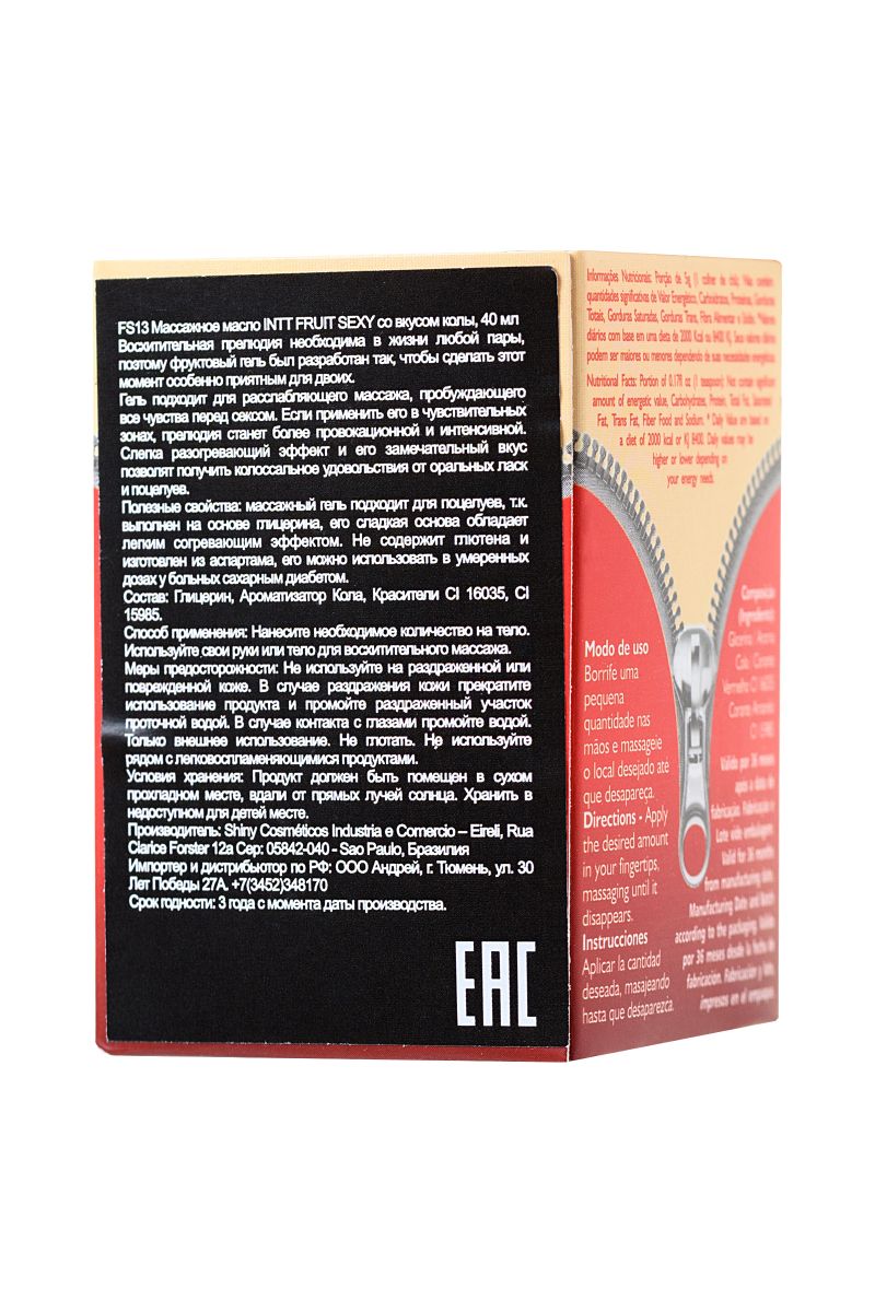 Искра. Буря. Экстаз. Может ли массаж подарить такое? Может, если это массажное масло для поцелуев Intt Fruit Sexy с ароматом колы. Позволяет экспериментировать. Поскольку масло обладает разогревающим эффектом и предназначено для поцелуев, можно не ограничивать себя в сценариях интимных игр. Нанесите Intt Fruit Sexy на тело, поцелуйте несколько чувствительных точек и подуйте на них в течение 3 секунд — возбуждение не заставит себя долго ждать. Провоцирует желание. Соблазнительный аромат колы создает игривое настроение и помогает расслабиться. Абсолютно безопасная и протестированная формула без сахара и глютена подходит даже аллергикам и диабетикам. Не оставляет ощущения липкости и легко смывается водой.INTT — удовольствие в каждой капле.