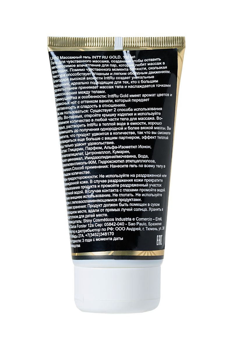 Массажный гель Intt Ru Gold с цветочным ароматом — беспроигрышный вариант для совершенных моментов близости. • Подвластны особенные виды массажа. Плотная, нерастекающаяся текстура геля обволакивает тело и прекрасно расслабляет. Она превосходно справится даже со специальной техникой массажа - телом по телу. Приятный цветочный аромат с ванильным оттенком отвлекает от повседневных мыслей и настраивает на близость. Уникальная формула позволяет экономично расходовать количество геля. Просто разведите часть геля теплой водой в отдельной емкости и наслаждайтесь еще большим скольжением. Абсолютно безопасный и клинически проверенный состав не вызывает аллергии или раздражения, не оставляет липких пятен и легко смывается водой.Intt Ru Gold создан для вашего удовольствия.