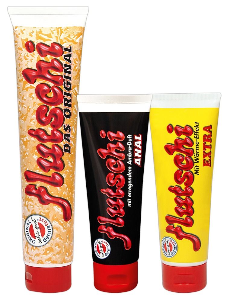 Набор лубрикантов Flutschi 3 Piece Set. Включает в себя лубрикант на водной основе Flutschi Classic с ароматом амбры (200 мл.), лубрикант с сужающим эффектом Flutschi Extra with tingling effect (80 мл.) и анальную смазку Flutschi Anal for anal pleasures (80 мл.). В наборе: лубрикант на водной основе Flutschi Classic с ароматом амбры - 200 мл. лубрикант с сужающим эффектом Flutschi Extra - 80 мл. анальный лубрикант Flutschi Anal - 80 мл.