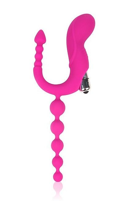 Вибромассажер из коллекции Cosmo сделает вашу интимную жизнь яркой, насыщенной и многообразной! Потрясающий эротический аксессуар с множеством функций станет вашей любимой секс-игрушкой! В арсенале вибромассажера - анальная цепочка в виде елочки, двойной стимулятор и режим вибрация. Дополнительное удовольствие во время любовных утех подарят небольшие ребрышки. Оригинальная форма стимулятора позволит воздействовать на точку G. Интимный аксессуар Cosmo - фееричный секс в любое время! Диаметр вагинального стимулятора - 3,1 см. Диаметр анальной цепочки - 2,1 см. Диаметр анального отростка - 1,4 см. Рабочая длина - 9-12 см.