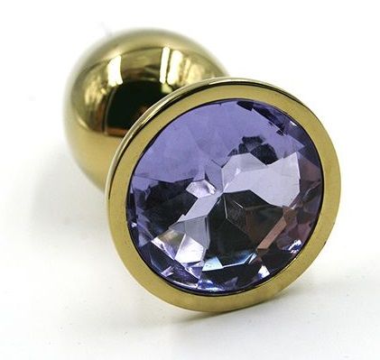 Золотая анальная пробка из алюминия размер S. Страз в основании круглой формы, выполнен из стекла светло-фиолетового цвета. Упакована в вельветовый мешочек для хранения. Вес - 52 гр.