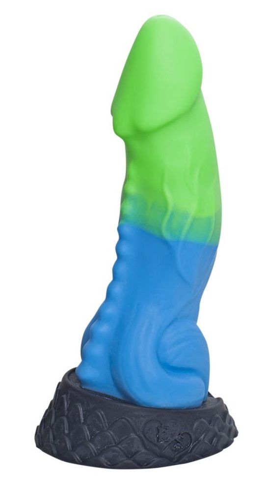 Если в фантазиях вашим партнёром выступает не человек, присмотритесь к этой модели от Erasexa – первого и пока единственного российского производителя товаров интимного назначения для поклонников зооэротики. Этот голубой фаллос мог бы принадлежать мощному и свирепому животному с кожистыми крыльями и острыми клыками. Ночная Фурия Medium – стимулятор в виде полового органа дракона, сделанный вручную из эластичного и приятного на ощупь силикона. Ограничительное основание чёрного цвета покрыто чешуйками для пущей реалистичности. Податливый ствол с зелёной головкой плавно расширяется книзу и образует мышечный узел, благодаря которому особенно сильное растяжение вагинальных/анальных стеночек вы будете ощущать на входе. Диаметр головки - 5,4 см. Диаметр ствола до узла - 6,7 см.