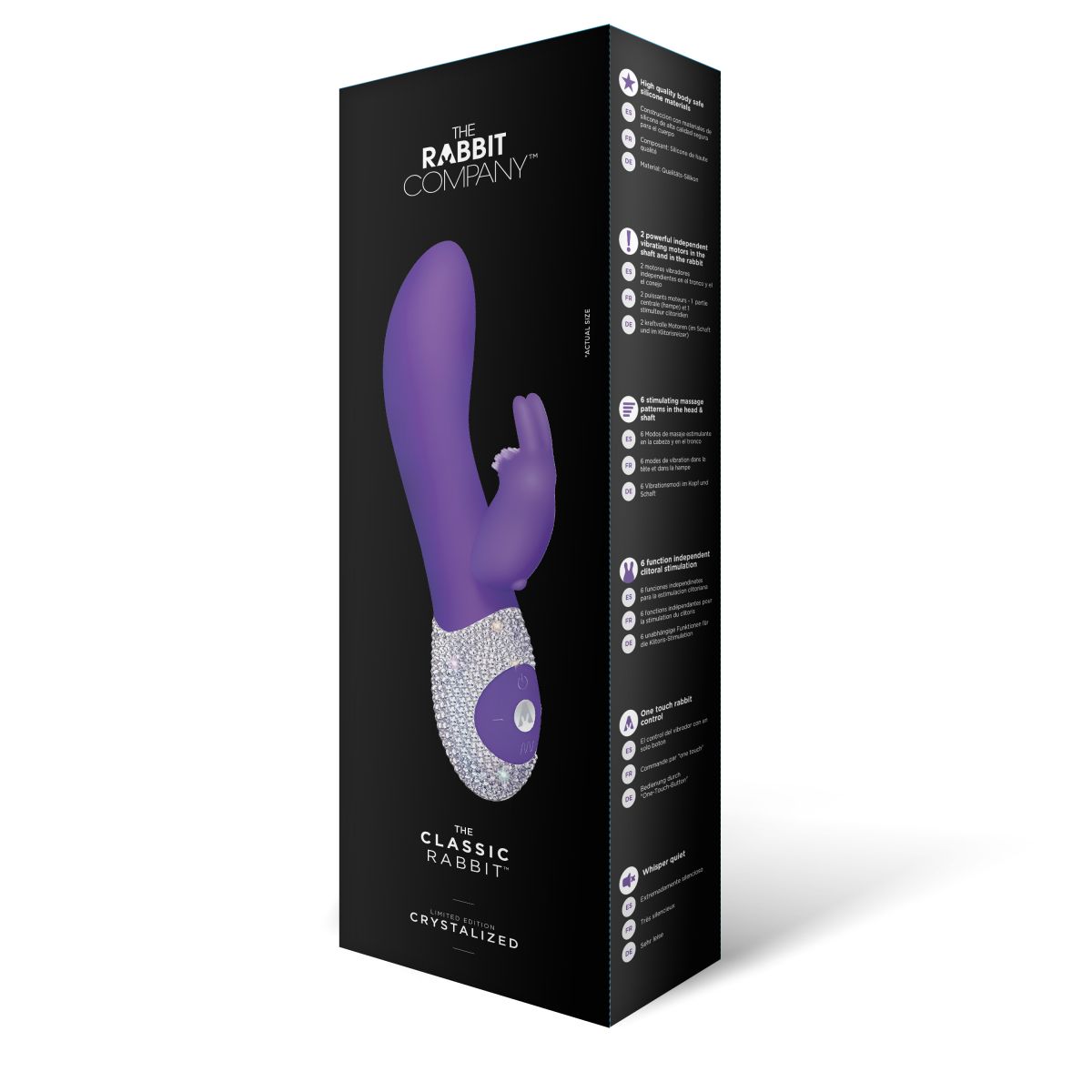 Классика никогда не выходит из моды не только в литературе и одежде, но и когда дело касается удовольствий. Качественный, безопасный и красивый массажер фиолетового цвета с двумя вибромоторчиками большой мощности. Вагинальная часть массажера и клиторальный стимулятор в виде симпатичного зайчика имеет 6 уникальных функций - постоянная вибрация, волновая вибрация, пульсация, нарастающая вибрация, то нарастающая, то ниспадающая вибрация, и рандомная вибрация. На мордочку клиторального кролика нанесена нежная щеточка для дразнящих ощущений во время стимуляции. Данная модель розового цвета из ограниченной коллекции CRYSTALIZED - пульт управления вручную украшен супер переливающимися кристаллами. Кролик имеет очень легкое управление - чтобы включить кролика используй отдельную кнопку включения, тогда одновременно заработают и вагинальная часть и клиторальный зайчик. Рабочая длина - 11 см. Время зарядки - 2 часа. Время работы - 2 часа. В комплекте запасной набор кристаллов.